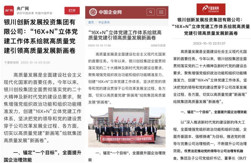 近日,央广网、中国企业网、宁夏新闻网等主流媒体聚焦国企高质量发展的生动实践,深度报道了银川创投集团党的建设成果。