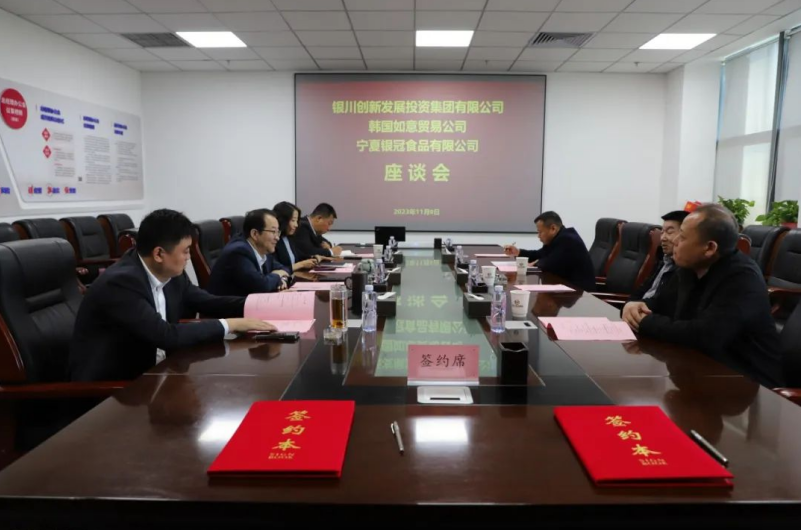 11月9日上午,银川创投集团党委书记、董事长何晓锐在集团会见了前来拜访的韩国RURI TRADING COMPANY(如意贸易公司)中国区代表李钟明一行,并现场见证集团旗下宁夏银冠食品有限公司与韩国如意贸易公司签订1000万美元的优质冷凉蔬菜外贸销售协议,助力宁夏优质蔬菜迈向国际。集团公司总经理王丽梅、副总经理庄昊、综投公司总经理马晓伟、银冠食品公司总经理李红兵等参加签约会议。